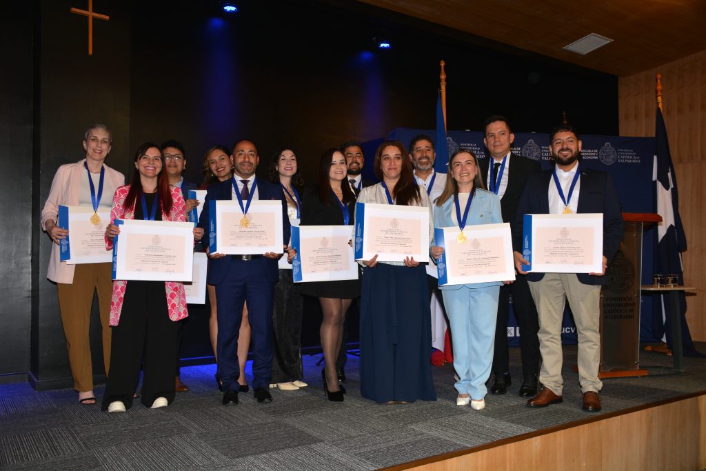 Durante la ceremonia, la Red Alumni PUCV otorgó un reconocimiento especial a un estudiante destacado de cada cohorte, distinción que refleja el compromiso, rendimiento académico y liderazgo demostrados durante sus estudios.